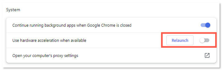 - Step 3: Turn off the "Use hardware acceleration when available" option and tap the "Relaunch" button to make sure the changes take effect.